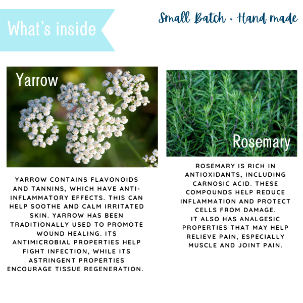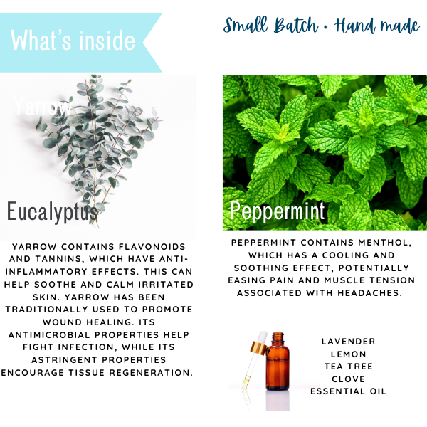 Ingredients: Sweet almond oil infused with herbs (eucalyptus, yarrow, rosemary) beeswax, essential oils (lavender, lemon, tea tree, clove)