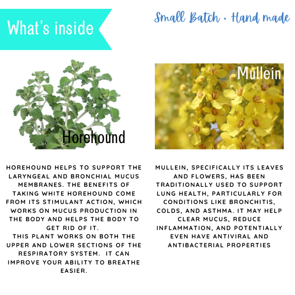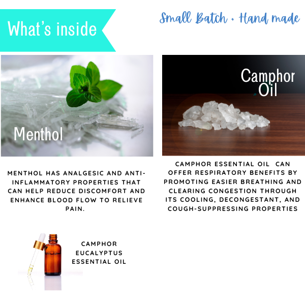 Ingredients: Sweet almond oil infused with herbs (mullein, horehound) menthol crystals, beeswax, essential oils (camphor, eucalyptus)