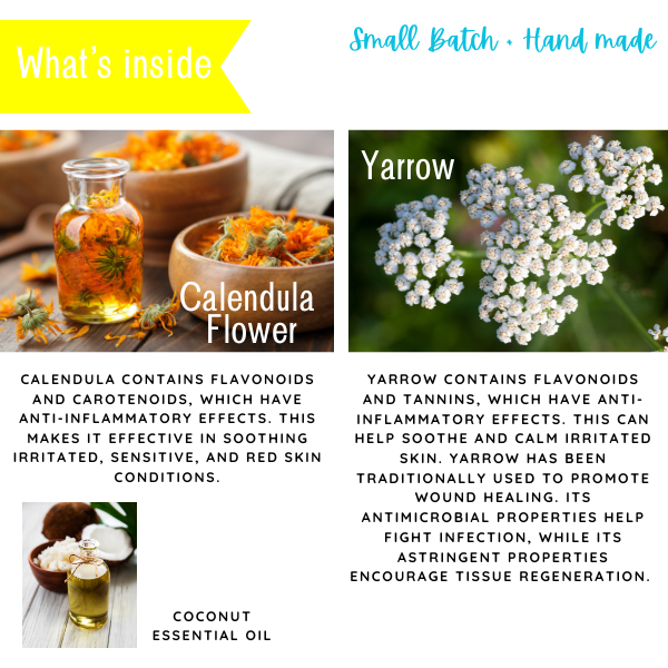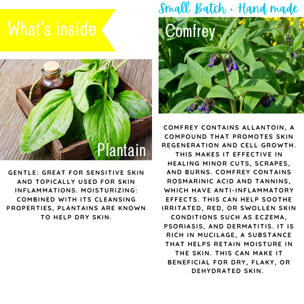 Ingredients: Sweet almond oil infused with herbs (yarrow, calendula, plantain, comfrey), beeswax, essential oils (Vanilla OR Sweet Orange Rum-depending on which scent you order)