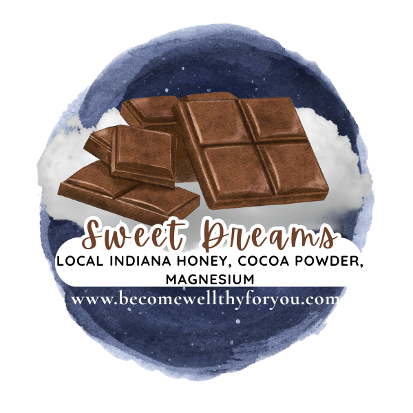 Sweet Dreams-This can be used as a calming evening time warm drink. It literally tastes like hot chocolate! Great for the kids! It is simply made of local Indiana honey, cocoa powder and magnesium. Serving suggestion for this one particular-1 Tbsp of infusion to 4 ounces of warmed (almost hot) milk of any kind.