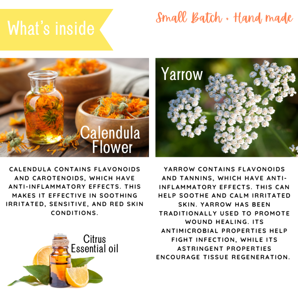 Ingredients: Sweet Almond and grapeseed oil magnesium infused with herbs (calendula, marshmallow root, yarrow), magnesium, beeswax, essential oils (citrus)