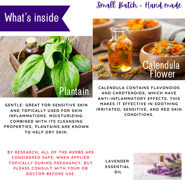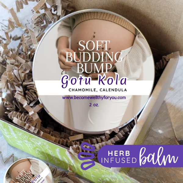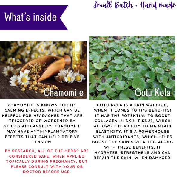 How to use: This is a great addition for your daily self care routine, as you are awaiting baby and taking care of yourself. Apply this balm to the belly twice per day-suggested as once in the morning and once at night. The main gem herb in it is called Gotu Kola. It is a skin warrior, when it comes to it’s benefits! It has the potential to boost collagen in skin tissue, which allows the ability to maintain elasticity. It’s a powerhouse with antioxidants, which helps boost the skin’s vitality. Along with these benefits, gotu kola hydrates, strengthens and can repair the skin, when damaged.