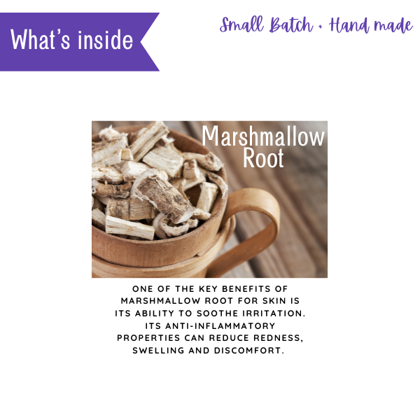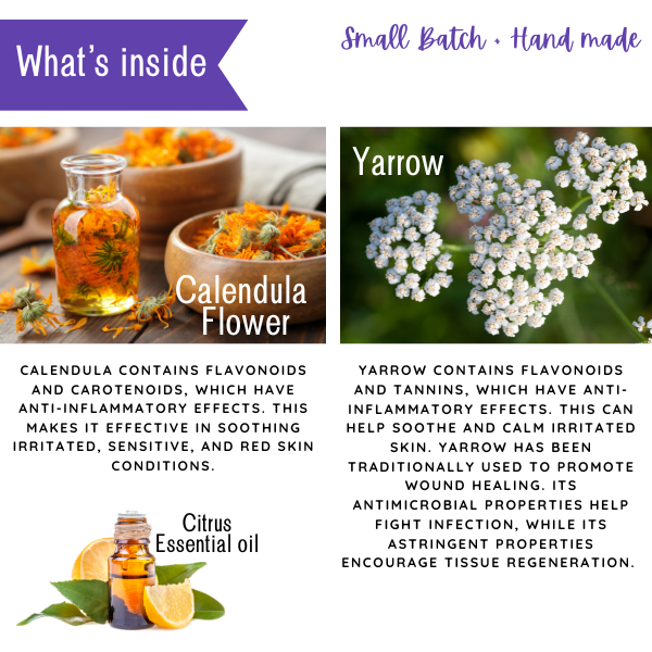 Ingredients: sweet almond oil, grapeseed oil. magnesium, herbs (calendula, marshmallow root, yarrow), beeswax, honey, essential oils (citrus), arrow root powder